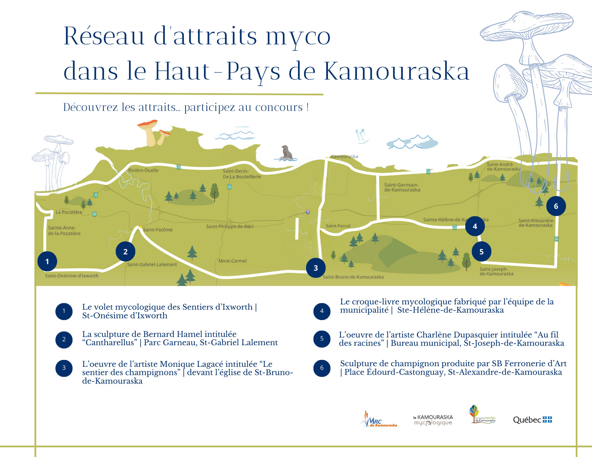 Plusieurs municipalités du Haut-Pays de Kamouraska ont mis en place un attrait mettant en valeur les champignons, formant ainsi un réseau dans les villages du plateau forestier. Nous vous invitons à visiter chaque site comme un prétexte pour explorer et découvrir le territoire du Haut-Pays de Kamouraska en mode mycotouriste !